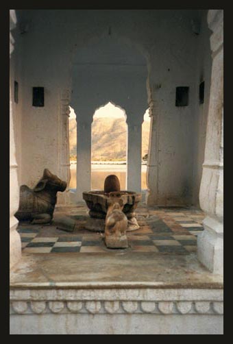 Nandi, la vache sacrée, veillant sur le Lingam de Siva aux pied du lac de Pushkar