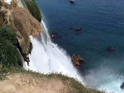 Les Chutes d'eau de la tulmutueuse rivière Duden se jètent dans la mer, du haut des falaises, Antalya