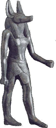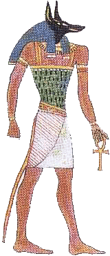 Protecteur de la ville de Kasa, dont l'emblème était le chien errant, Anubis est très tôt devenu le patron des embaumeurs en inventant la momification.